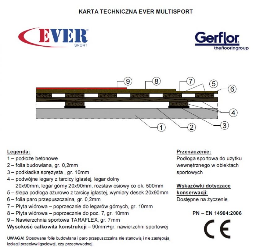EVERSPORT posiada autorską konstrukcję drewnianą podwójnie legarowaną na podkładkach elastycznych, zgodną ze wszystkimi parametrami normy EN-PN 14904 i posiadającą certyfikat CE. Sprawdzona i stosowana od wielu lat, w zależności od potrzeb użytkowników oferujemy systemową podłogę EVERSPORT z wykładzinami sportowymi o grubości od 3 mm do 9 mm.