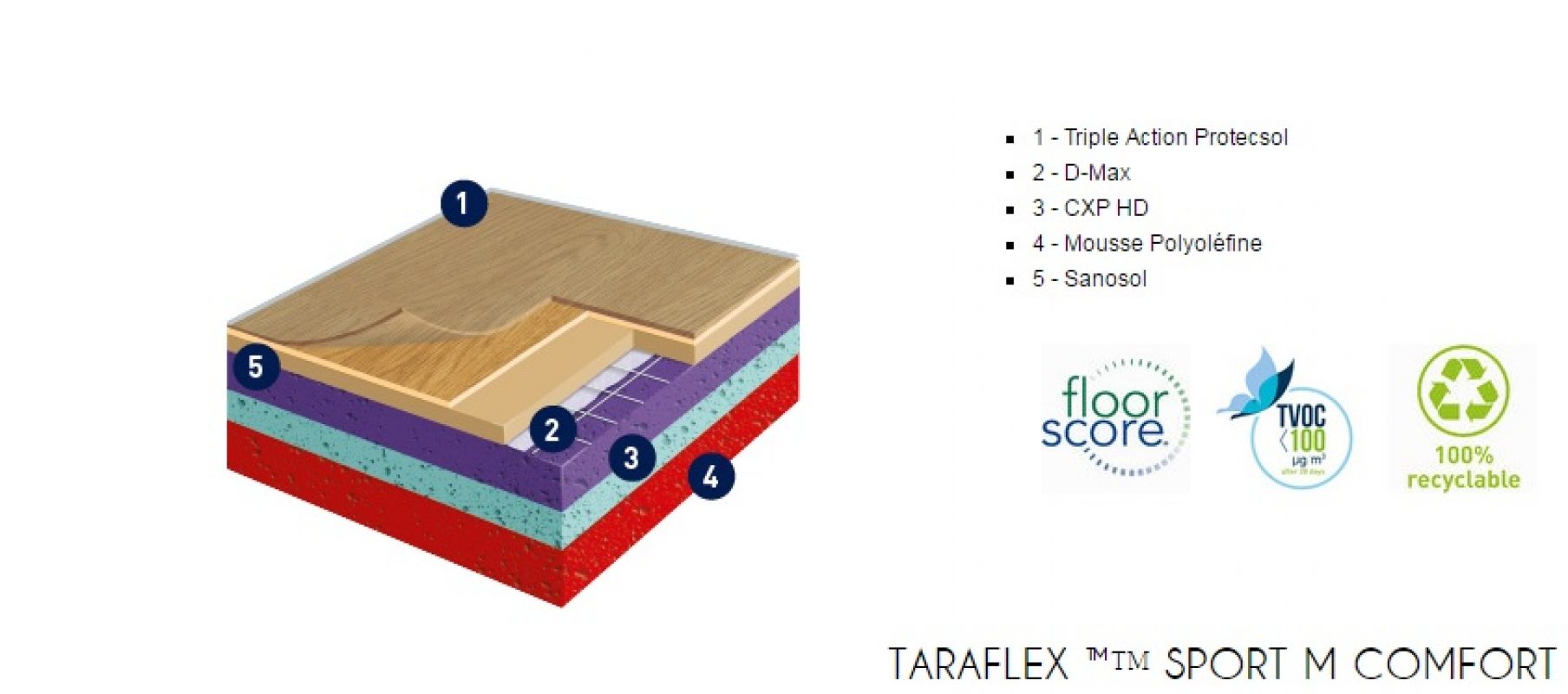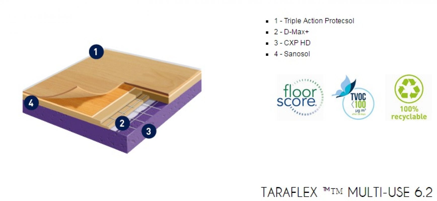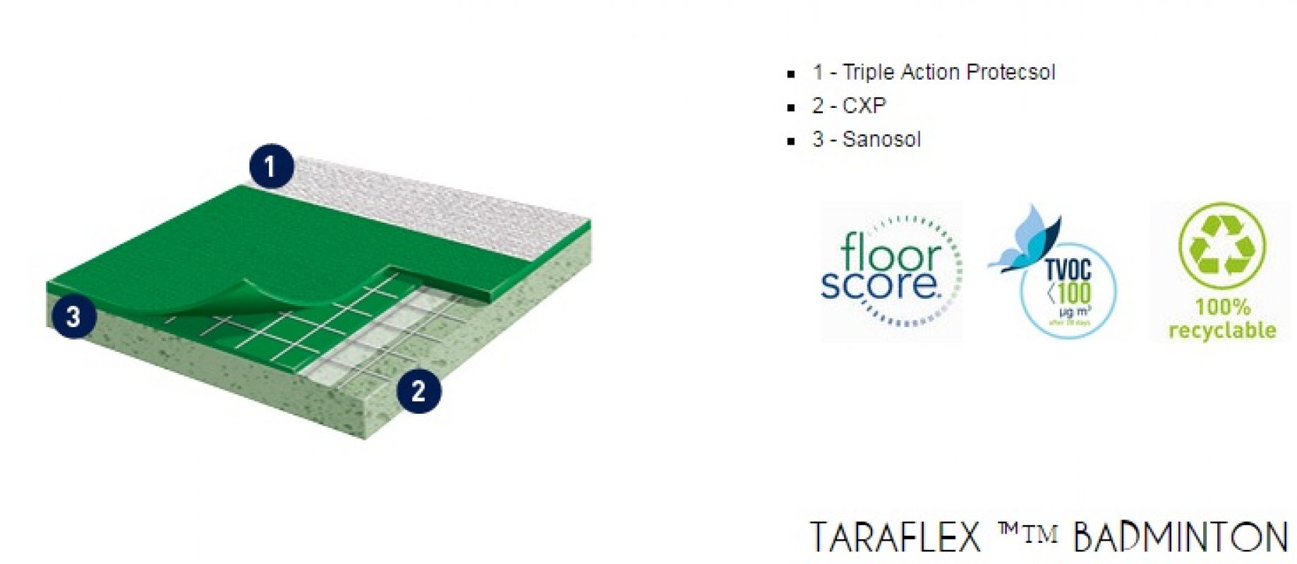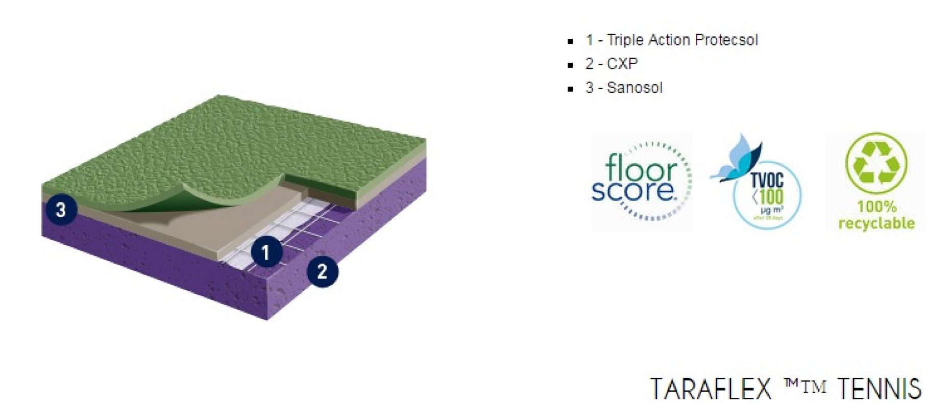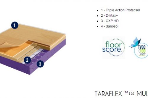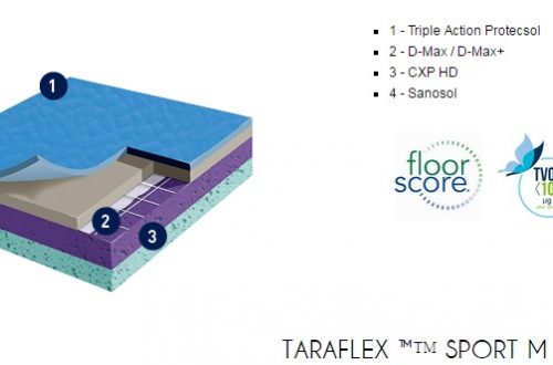 Gerflor TARAFLEX (w potocznym nazewnictwie TERAFLEX) to syntetyczna wielowarstwowa nawierzchnia sportowa, której wierzchnia warstwa o strukturze „skórki pomarańczy” (gr. 2,1mm) wykonana jest z czystego winylu, środek wzmocniony siatką z włókna szklanego, a warstwa spodnia (sprężysta) z pianki PVC. Powierzchnia wykładziny zabezpieczona jest specjalnym środkiem PROTECSOL, który tworzy usieciowaną strukturę zabezpieczającą przed zabrudzeniami, zmniejsza koszty konserwacji oraz łagodzi skutki niszczenia. Cała wykładzina impregnowana jest środkiem SANOSOL, stanowiącym zabezpieczenie przeciw-pleśniowe i bakterio-statyczne.